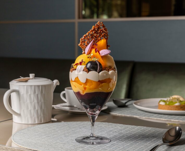 アルマーニ / カフェ 表参道の人気メニュー、月替わりのパフェ。10月は、旬の長野パープルと柿を主役に、カボチャやラムの香りを重ねた、秋の味わいが広がるパフェが登場します。