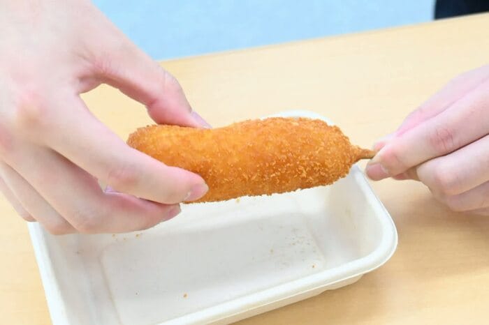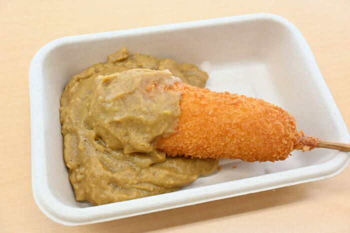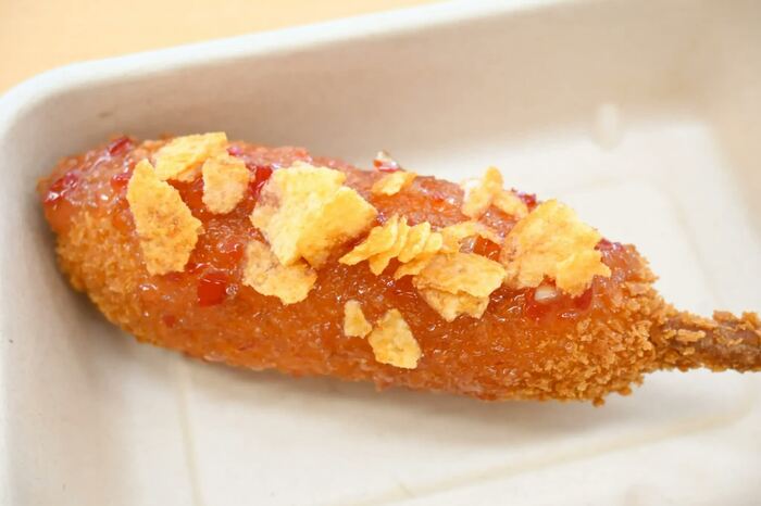 “これでもか!”というほど、カレールーがかかったハットグ。ルーの味はコクのある「甘口」だ。シンプルながらも、ハットグのソーセージやチーズとのバランスがとても良い。カレーパンとホットドッグを融合させたかのような、斬新な商品だ。