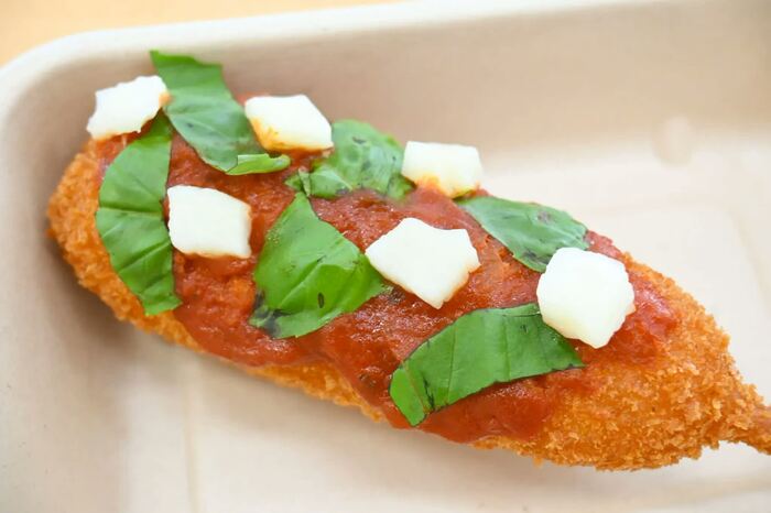 トマトソース、バジル、モッツァレラチーズと、まるで「マルゲリータピザ」のような材料をトッピング。オーソドックスかと思いきや、ソースの酸味と、ハットグの生地の甘みがベストマッチ。モッツァレラチーズと中のチーズの組み合わせも面白い。