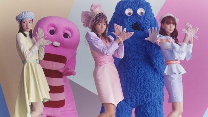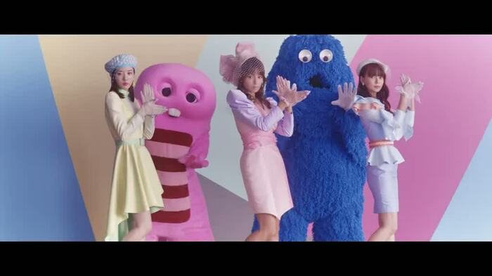 今回は深田(長女)、多部(次女)、永野(三女)と、ピンクガチャ(ママ)、ブルームク(パパ)がWinkの代表曲「淋しい熱帯魚」にあわせてダンスを披露。パステルカラーのレトロなファッションに身を包み、歌詞やセリフに合わせて息の合ったポーズを決める。