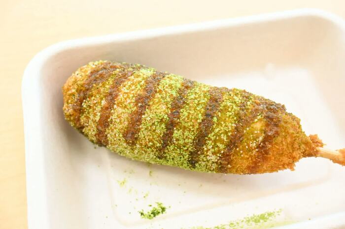 品評会での順位が11位というのが意外なほど美味しい、デザート系ハットグ。抹茶パウダーや黒蜜の風味とハットグ生地の食感が揚げパンにそっくりで、「好きかも!」との声も複数。商品名のとおり、“京都の世界観”が口のなかで広がる逸品だ。