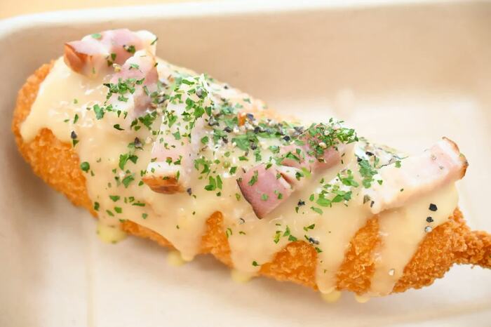 パスタやピザでおなじみのカルボナーラソースをハットグにトッピング。クリーミーなソースとハットグの生地の甘み・中のチーズの風味が、絶妙にマッチしている。角切りベーコンも盛り付けられているので、“お肉系”が好きな方にぜひおすすめしたい。