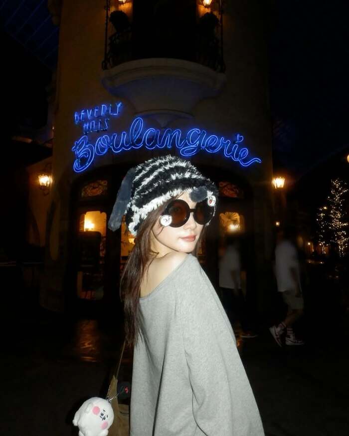 ネオンサインが光るレストラン『ビバリーヒルズ・ブランジェリー』をバックに、横向きでカメラに振り向きながら、トップスの肩を落として肌見せショットも披露!