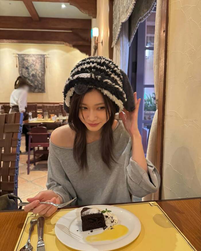 他にも、スヌーピーのキャップを深くかぶり目元を覆いながら、首を傾けた遊び心あるカットも公開。