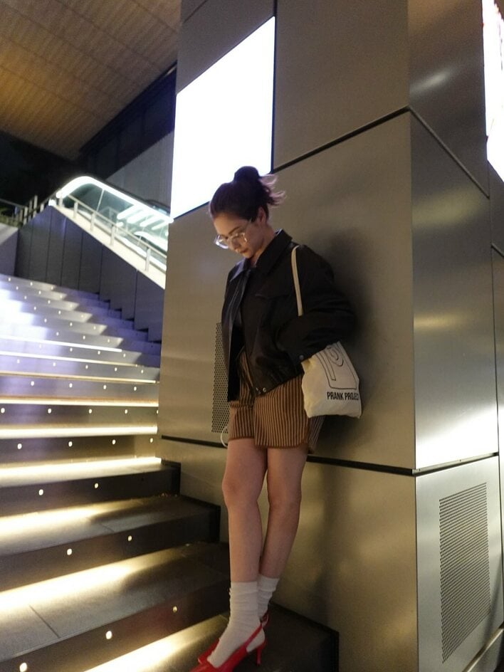 エスカレーターに乗りながら頭上にあるカメラの方を見上げる村重さん。GENTLE MONSTERのメガネが村重さんのコーディネートに華を添えています。