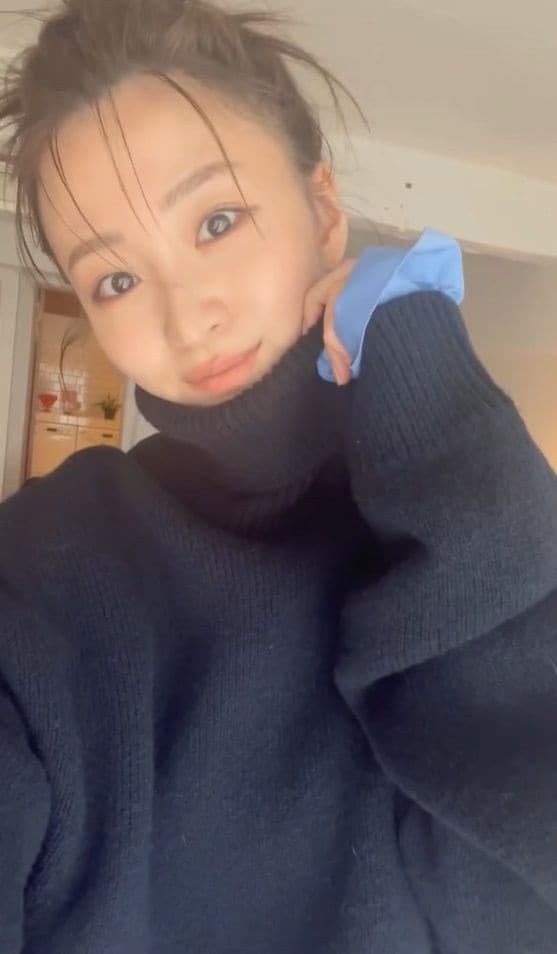 ネイビーのタートルニットの姿も。ゆるっとお団子が目を引きます。