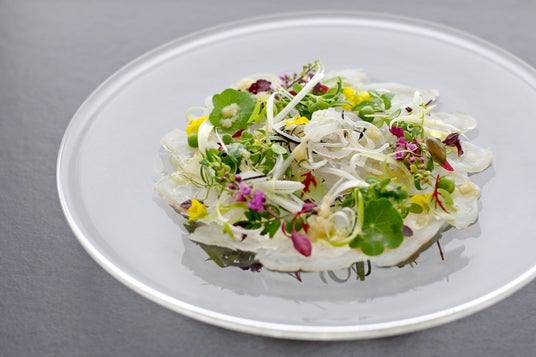 てっさ風カルパッチョ サラダ仕立て繊細に薄く引いたとらふぐを、新鮮野菜と共に。