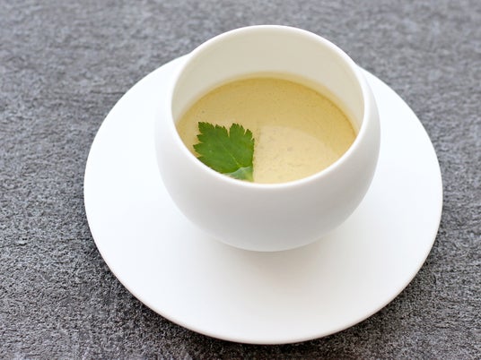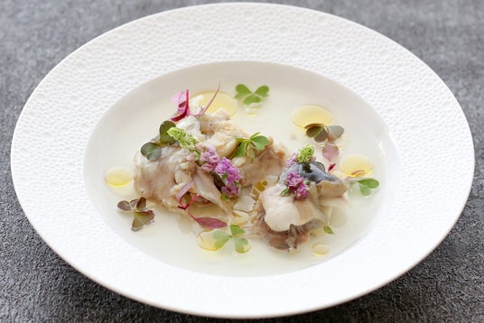 ふぐ兜煮の洋風コンソメ仕立て骨から引き出した滋味深い旨みに、トマトの余韻とシェリー酒の香りを添えて。