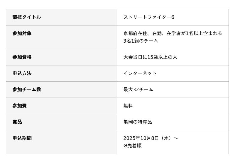 京都府亀岡市(市長:桂川孝裕)は、市制70周年を記念し、2025年12月21日(日)に「eスポーツ大会 KAMEOKA CUP(以下、本大会)」をサンガスタジアム by KYOCERA内のeスポーツゾーンにて開催します。本大会は、eスポーツを「年齢や経験を超えて誰もが競い合えるスポーツ文化」と位置づけ、スタジアムを核とした賑わいの創出を目指す取り組みです。世界的人気格闘ゲーム「ストリートファイター6」の公認大会として実施します。同時に、初心者でも参加できる体験会等も開催し、健康の増進や世代を越えた交流の増加を目指します。