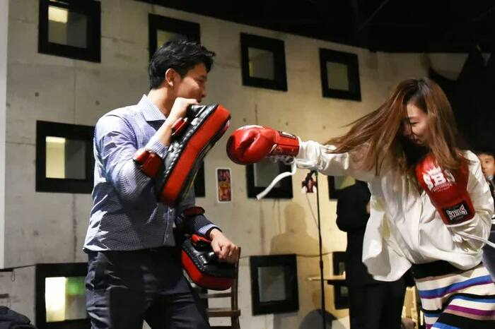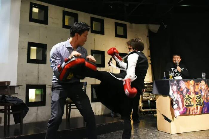 司会でRIZINのリングアナも務めるお宮の松から「ここで、ミット打ちをお願いします」と提案が。朝倉兄弟のトレーニングの相手をしている宮島さんが、パンチやキックを受けてくれるということで会場のお客さんが相手に。女性も参加して会場は大盛り上がり!
