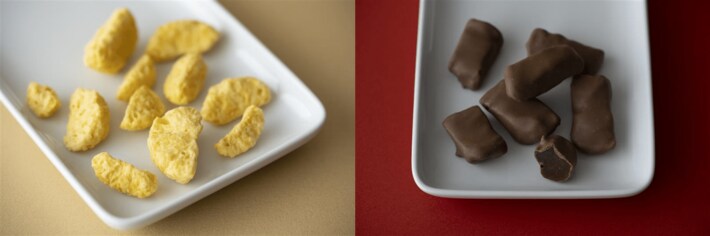今回発売する不揃いしみこみチョコシリーズに使用するフルーツは、いずれも大きさや形が不揃いでも味は変わらないフルーツを使っています。昨年好評をいただいた「不揃い しみこみヨーグルトチョコ いちご」、「不揃い しみこみチョコ りんご」に「不揃い しみこみチョコ 温州みかん」を新たに追加して、計3種で発売します。「不揃い しみこみチョコ 温州みかん」は、見た目よりも味わいにこだわってつくった商品で、食品廃棄ロス削減にもつながっています。