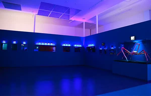 漁港を再現したコーナーがあります。僕らがいつも上から覗いている漁港に、ドボンと潜ったらきっとこんな世界が広がっているだろうと。人工物である岸壁があってコンクリートの壁があって、海面には自然由来の海藻が浮かんでいて、岸と漁船を繋ぐ係留(けいりゅう)ロープがあって。