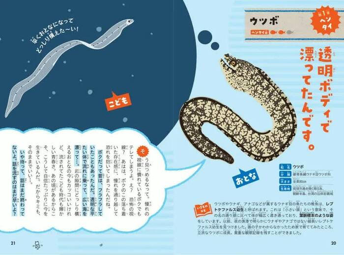 ――そんな幼魚をたっぷり紹介した書籍では、絵本のようにかわいらしいイラスト、文章も魚類がしゃべっているようなテイストで楽しい内容になっています。