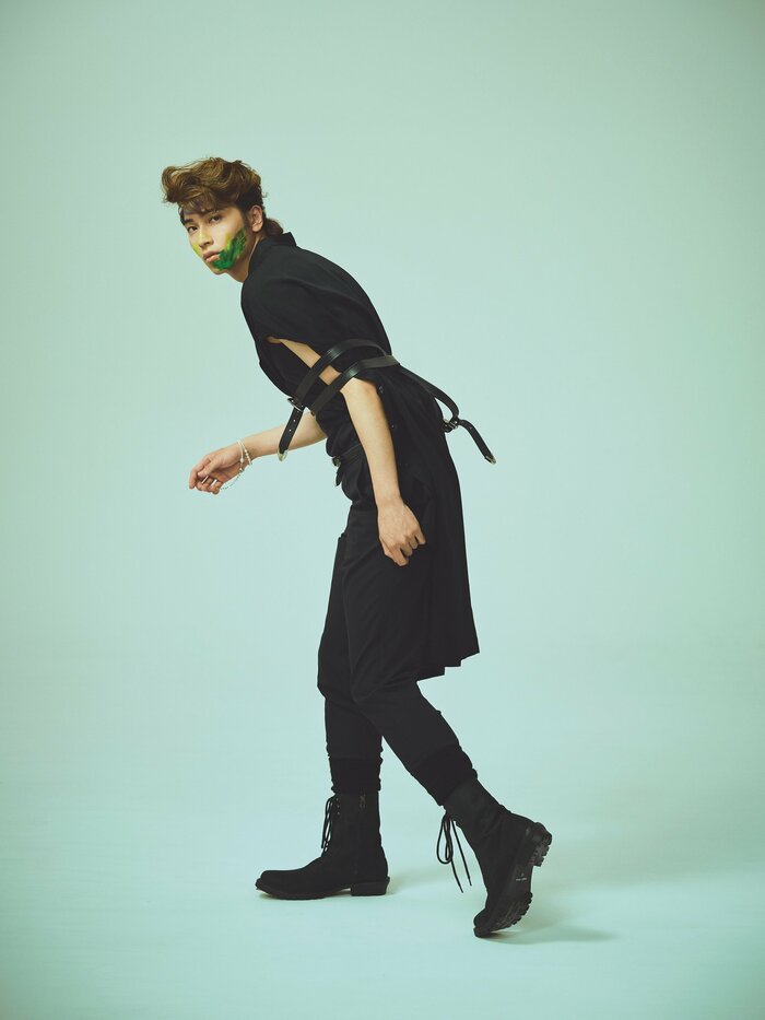 基本的にはブラックコーデですが、そこに塗料を顔に塗って。さらに、ベルトを締めたときも意外と自分の中で動けたなという感覚がありました。縛られている事実は変わりませんが、意外と動ける余地があるという面白さ。抜け出そうと思えば、抜け出せそうなところがあるといいますか。見えとしては縛られていますが、遊びがあるみたいなところで、またこの後の文章につながる絵ができたと思うので、このカットを選びました。