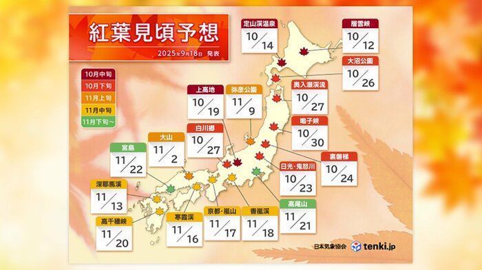 今年の見頃予想を日本気象協会が出していますが、9月の18日に出したもので、この後も猛暑が続いたのでもっと遅くなるかもしれません。