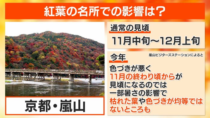 (紅葉の)通常の見頃が大体11月中旬から12月上旬なんですが、嵐山ビジターズステーションの方によると、今年は色づきが悪くて11月の終わり頃から見頃になるのではということです。また、一部暑さの影響で枯れた葉や色づきが均等ではない。