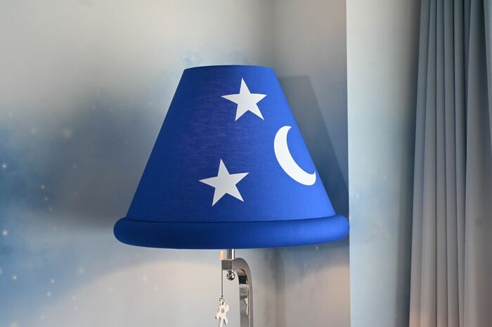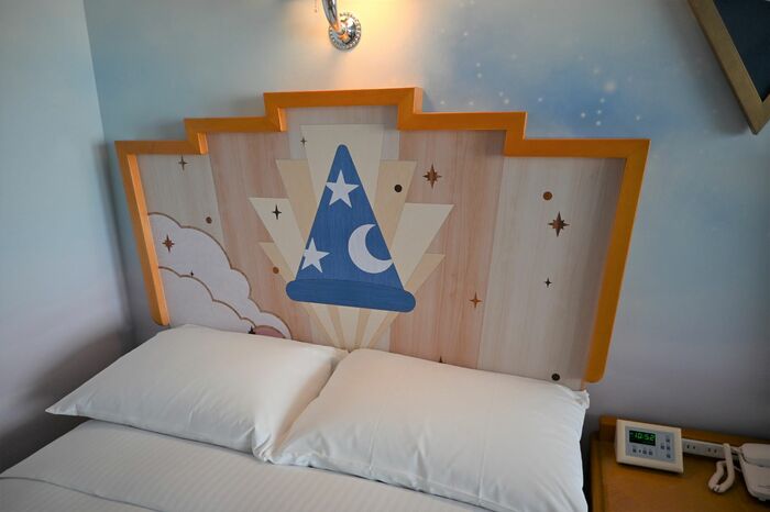 ちょうど、ベッドのヘッドボード部分に「魔法使いの帽子」が描かれていて、これは、ゲストにも魔法のような夢を見てもらいたいという思いが込められているんだとか!
