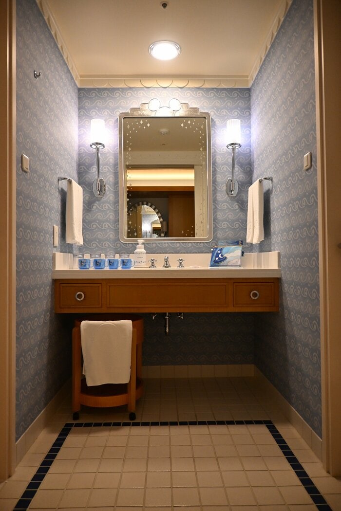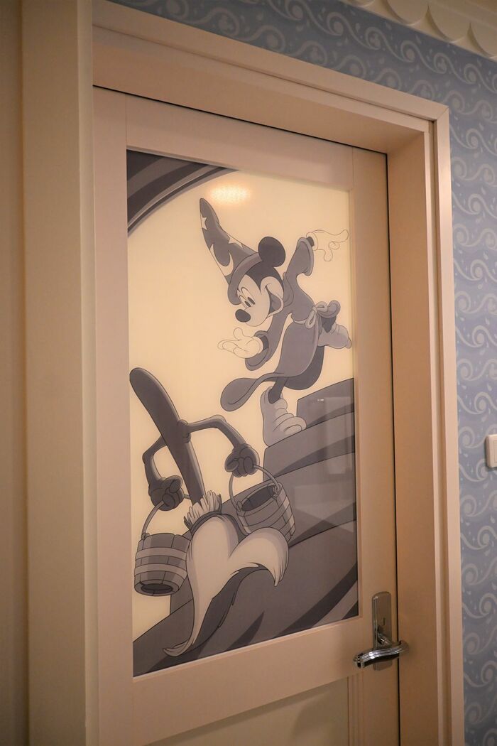 お風呂の扉に、ミッキーとほうきがデザインされていて、部屋のいたるところに世界観がたっぷりと表現されていて、思い出に残りそうですね。