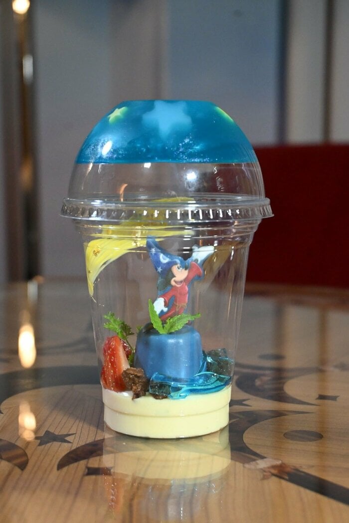 ライム風味のホワイトチョコレートムースとブルーゼリーのデザートで、ミッキーは砂糖菓子で作られているので食べられます。