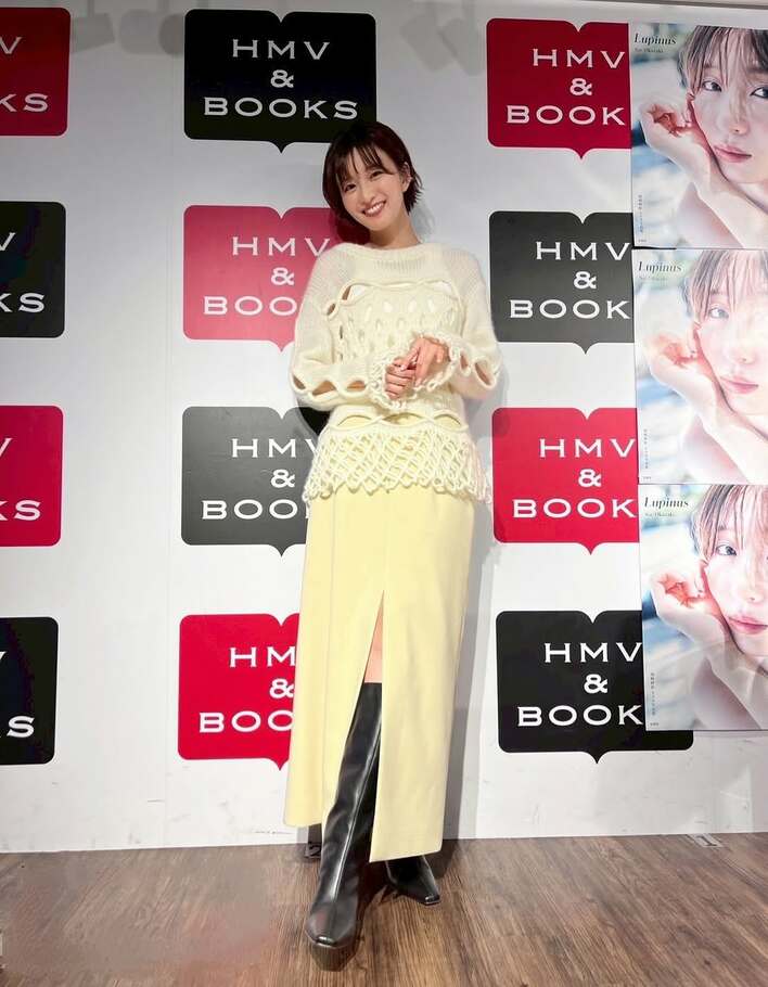この日は、壁にずらりと飾られた自身のポスターの前で、手を広げて笑顔を見せていて、アイボリーの穴あきニットを身にまとい、すっかり秋めいたスタイルがとても素敵です。