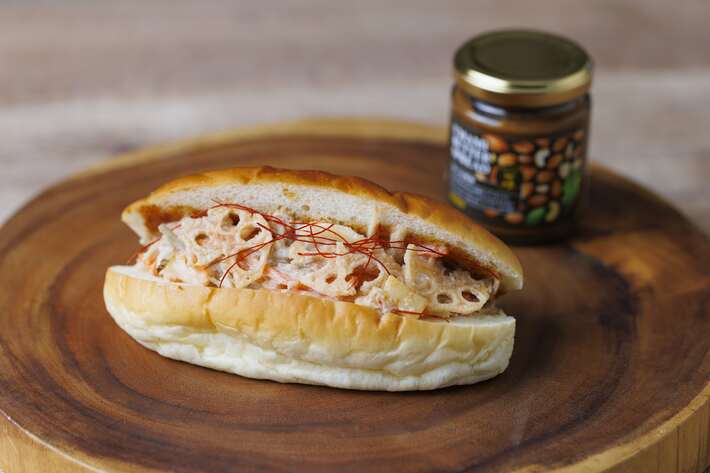 酒種コッペパンにUMAMI BUTTER SPREADを塗り、たらこマヨで和えたきんぴらごぼうをサンド。香ばしいれんこんチップスを添えました。