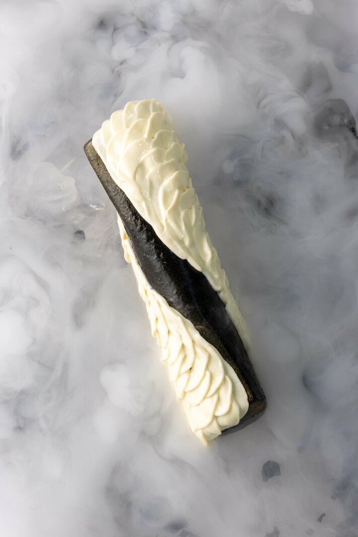 今年のブッシュ・ド・ノエルは、黒と白のドレスを纏ったようなモダンでエレガントな佇まい。「ル・ショコラ・アラン・デュカス」のショコラで仕立てたフィヤンティーヌに、芳醇なバニラのビスキュイ、甘酸っぱい苺のマルムラードを重ね、柚子の香りを効かせた黒と白の軽やかなクリームで包みました。