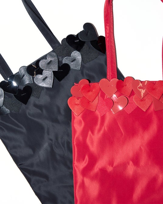 新作はBASICKSのアイコンでもあるハートモチーフをランダムに施したトートバッグと巾着バッグの2型をラインアップしました。ハートのパッチが遊び心あるデザインになっています。