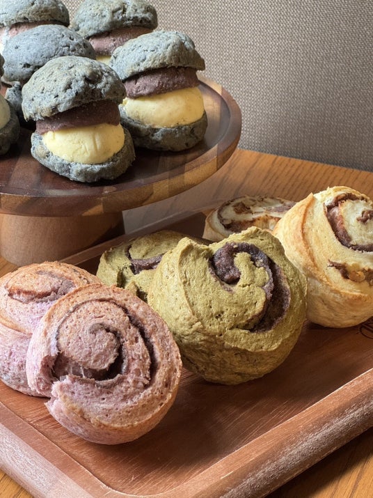 <カラフルクリーム>手前左から:紫いもあんこスコーン/ほうじ茶あんこスコーン/くるみあんこスコーン 各389円(1個) ※各日各30点限り 、奥:さつまいもバターあんこサンド 454円(1個) ※各日30点限り