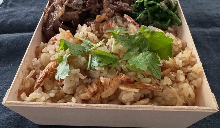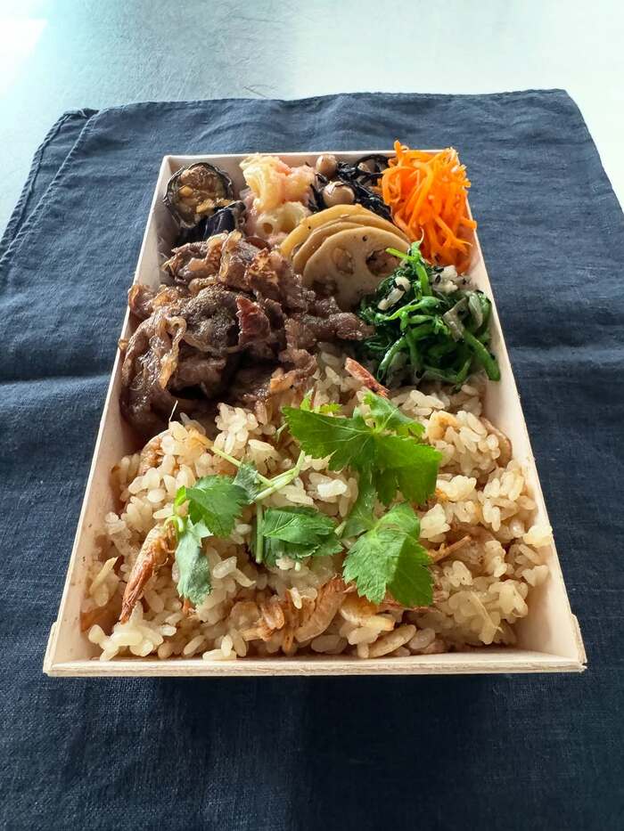 お弁当箱の半分ほどの面積を占めた炊き込みご飯は、「桜エビと新ショウガ」が混ぜ込まれているそうで、お米一粒一粒が粒立っていて、ふっくらしています。
