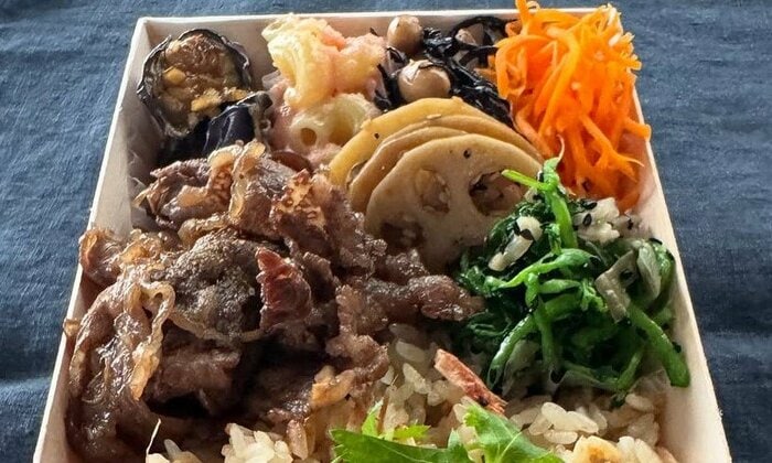 隣には、ボリュームたっぷりの「牛肉のしぐれ煮」や、あらかじめ作り置きしていたという、ほうれん草のあえ物や、ひじきの煮物、マカロニサラダなど6品のおかずがぎっしり!