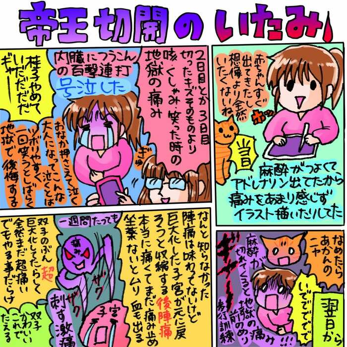 「わたしは帝王切開で 陣痛は味わってないけど 違う痛さがそれぞれあるから 本当にみんな命懸けなんだなぁと痛感しました 痛いよう」と、出産翌日からの痛みに耐えられず、号泣する姿が描かれています。
