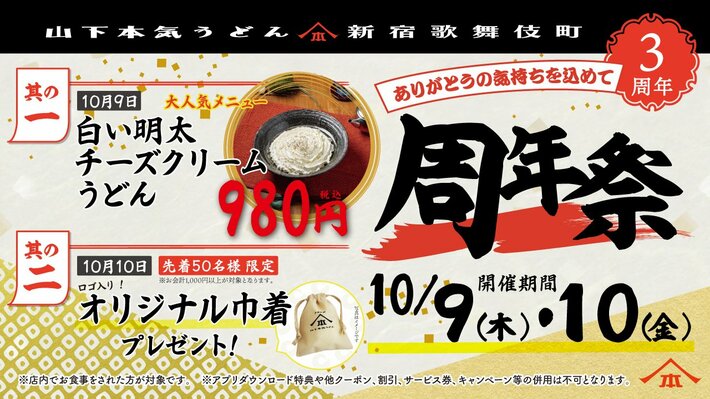 期間中に「山下本気うどん 新宿歌舞伎町」にご来店いただいたお客様を対象に、10月9日(木)は白い明太チーズクリームうどんを980円(税込)で提供し、10月10日(金)は先着50名様限定で、山下本気うどんオリジナル巾着をプレゼントいたします※2。