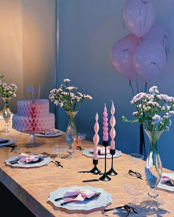 そして、長女のお誕生日会では、高級感のあるテーブルに、おしゃれなデザインの白いお皿とカトラリー、その上にピンクのリボンが置かれ、他にもピンクのキャンドルやお花も飾ることで、かわいらしい空間に仕上げた鈴木さん。