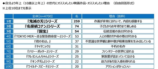 TOP5となった回答について、オススメしたい理由をみると、1位の「『鬼滅の刃』シリーズ」では「作画が非常にきれいで、内容も感動する」、2位の「『名探偵コナン』シリーズ」では「子どもからお年寄りまで楽しめる」、3位の「国宝」では「伝統芸能の良さがわかる」、4位の「『TOKYO MER~走る緊急救命室~』シリーズ」では「人との関わりや命の尊さがわかる」、5位「君の名は。」では「不思議な世界観と劇中歌が相乗効果を生み出している」といった回答がありました。