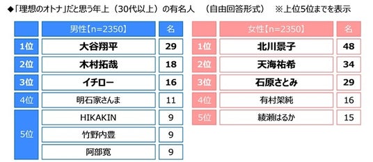 男女別にみると、男性では1位「大谷翔平さん」、2位「木村拓哉さん」、3位「イチローさん」となり、女性では1位「北川景子さん」、2位「天海祐希さん」、3位「石原さとみさん」となりました。