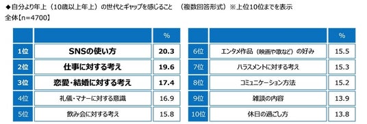 - 年上の年代に感じる世代間ギャップ 1位「SNSの使い方」北海道、静岡県、福岡県、佐賀県、宮崎県では「ハラスメントに対する考え」が1位に