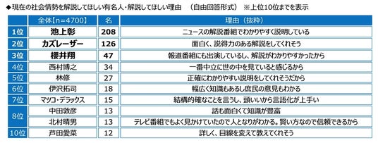 理由をみると、1位の「池上彰さん」では「ニュースの解説番組でわかりやすく説明している」、2位の「カズレーザーさん」では「面白く、説得力のある解説をしてくれそう」、3位の「櫻井翔さん」では「報道番組にも出演しているし、解説がわかりやすかったから」、4位の「西村博之さん」では「一番中立に世の中を見ていると感じるから」、5位の「林修さん」では「正確にわかりやすい説明をしてくれそうだから」といった回答が挙げられました。20代では、社会情勢に関する、わかりやすい解説や正確性の高い情報を求めている人が多いのではないでしょうか。