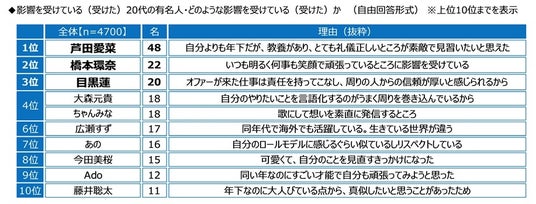 全回答者(4,700名)に、影響を受けている(受けた)20代の有名人を聞いたところ、1位は「芦田愛菜さん」となりました。回答した理由については、「自分よりも年下だが、教養があり、とても礼儀正しいところが素敵で見習いたいと思えた」などが挙げられました。勉強熱心な姿勢に影響を受けた人が多いようです。次いで、2位「橋本環奈さん」、3位「目黒蓮さん」、4位「大森元貴さん」「ちゃんみなさん」となりました。
