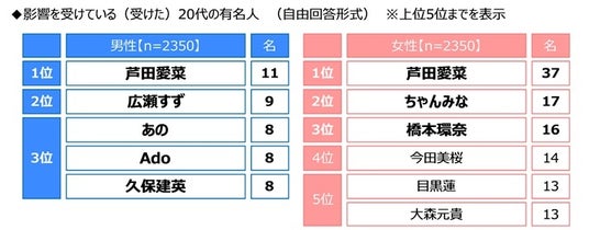 男女別にみると、男性・女性ともに1位は「芦田愛菜さん」となり、男性では2位「広瀬すずさん」、3位「あのさん」「Adoさん」「久保建英さん」となりました。女性では2位「ちゃんみなさん」、3位「橋本環奈さん」となりました。20代の女性では、2024年から2025年にかけて配信され人気となった、オーディション番組での活躍が大きな話題となった「ちゃんみなさん」への支持が厚いようです。