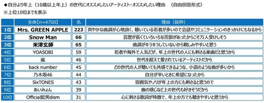 TOP5について、オススメしたい理由をみると、1位の「Mrs. GREEN APPLE」では「爽やかな曲調が心地良く、聴いている若者が多いので会話やコミュニケーションのきっかけにもなるから」、2位の「Snow Man」では「芸歴が長くていろいろな苦節があったからこそ万人受けしそう」、3位の「米津玄師さん」では「曲調がキラキラしていないから親しみやすいと思う」といった回答がありました。また、4位の「YOASOBI」では「若者や海外で人気だが、年上の世代の人にも刺さる楽曲だと思うから」、5位の「嵐」では「世代を超えて愛されているアーティストだから」といった理由が挙げられました。