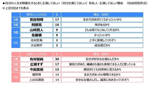 自分の人生を映画化するときに主演してほしい(自分を演じてほしい)有名人を聞いたところ、男性では1位「菅田将暉さん」となり、以降、2位「阿部寛さん」、3位「山崎賢人さん」「佐藤健さん」、5位「北村匠海さん」「大谷翔平さん」が続きました。