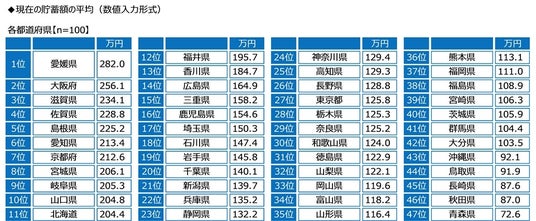 都道府県別にみると、現在の貯蓄額の平均が最も高くなったのは愛媛県で平均は282.0万円、次いで、大阪府(256.1万円)、滋賀県(234.1万円)、佐賀県(228.8万円)、島根県(225.2万円)となりました。また、最も低くなったのは青森県(72.6万円)で、最高額の愛媛県と比較すると209.4万円の差がみられました。