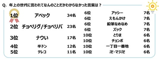 - 年上の世代に言われてなんのことだかわからなかった言葉 1位「アベック」、2位「チョベリグ/チョベリバ」、3位「ナウい」