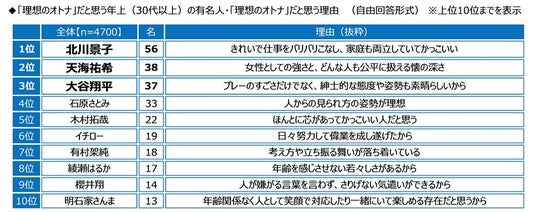 理由をみると、2位の「天海祐希さん」では「女性としての強さと、どんな人も公平に扱える懐の深さ」、3位の「大谷翔平さん」では「プレーのすごさだけでなく、紳士的な態度や姿勢も素晴らしいから」といった回答が挙げられました。