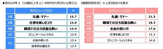 - 20代が年上の世代から学びたいこと 1位「礼儀・マナー」、女性では5人に1人