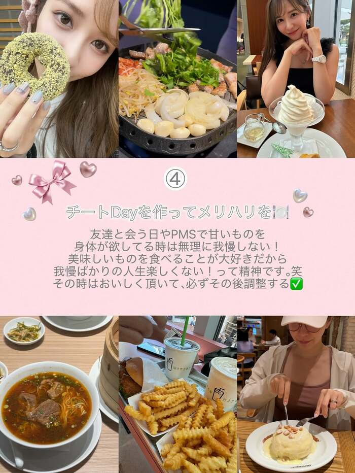 また、「チートDayを作ってメリハリを」(4つ目)と我慢ばかりしないことの大切さや…。