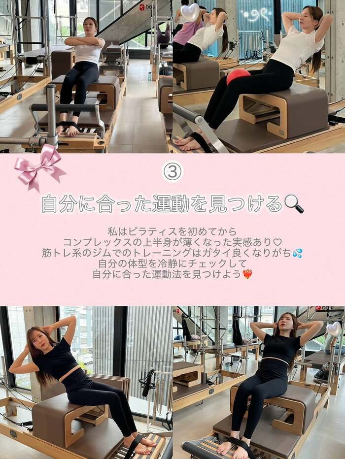 3つ目は「自分に合った運動を見つける」そうで、体勢が崩れないようにキープする姿が公開されています。「ピラティスを始めてからコンプレックスの上半身が薄くなった実感あり♡」と、効果を感じたよう。