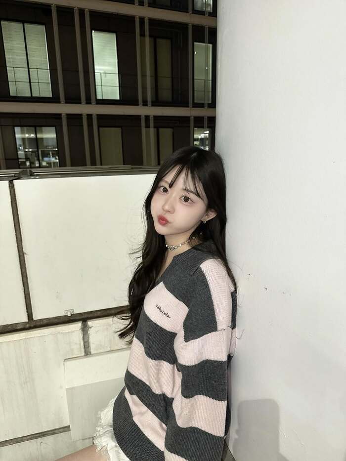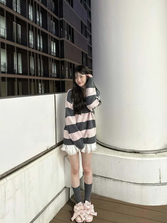 公開された写真には、ピンクとグレーのゆったりとしたボーダーニットに白いレースのミニスカートを合わせたコーディネートで、髪を耳にかけるしぐさをしながらカメラを見つめるりんかさんの姿が!