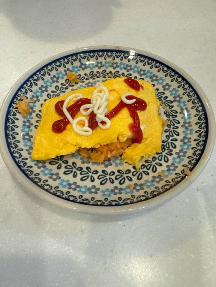 つやつやの黄色い卵は、破けることなくケチャップライスを覆っており、仕上げにはケチャップとマヨネーズがかけられています。