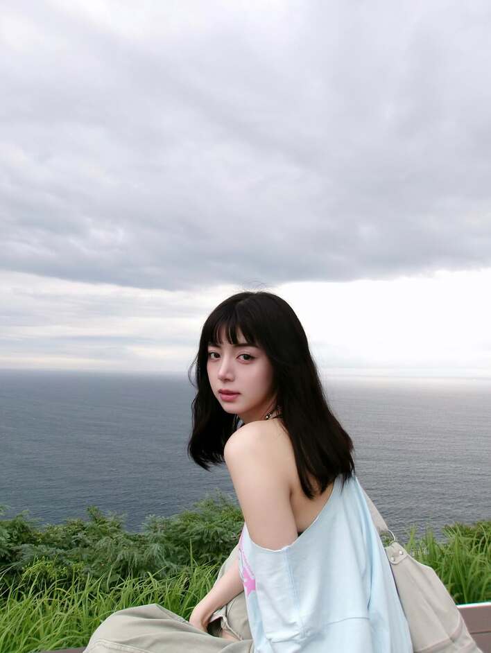 水色のオーバーサイズのトップスを大胆に落とした着こなしで、肩出しコーデを披露したエライザさんは、海をバックにアンニュイな表情で振り返っています。